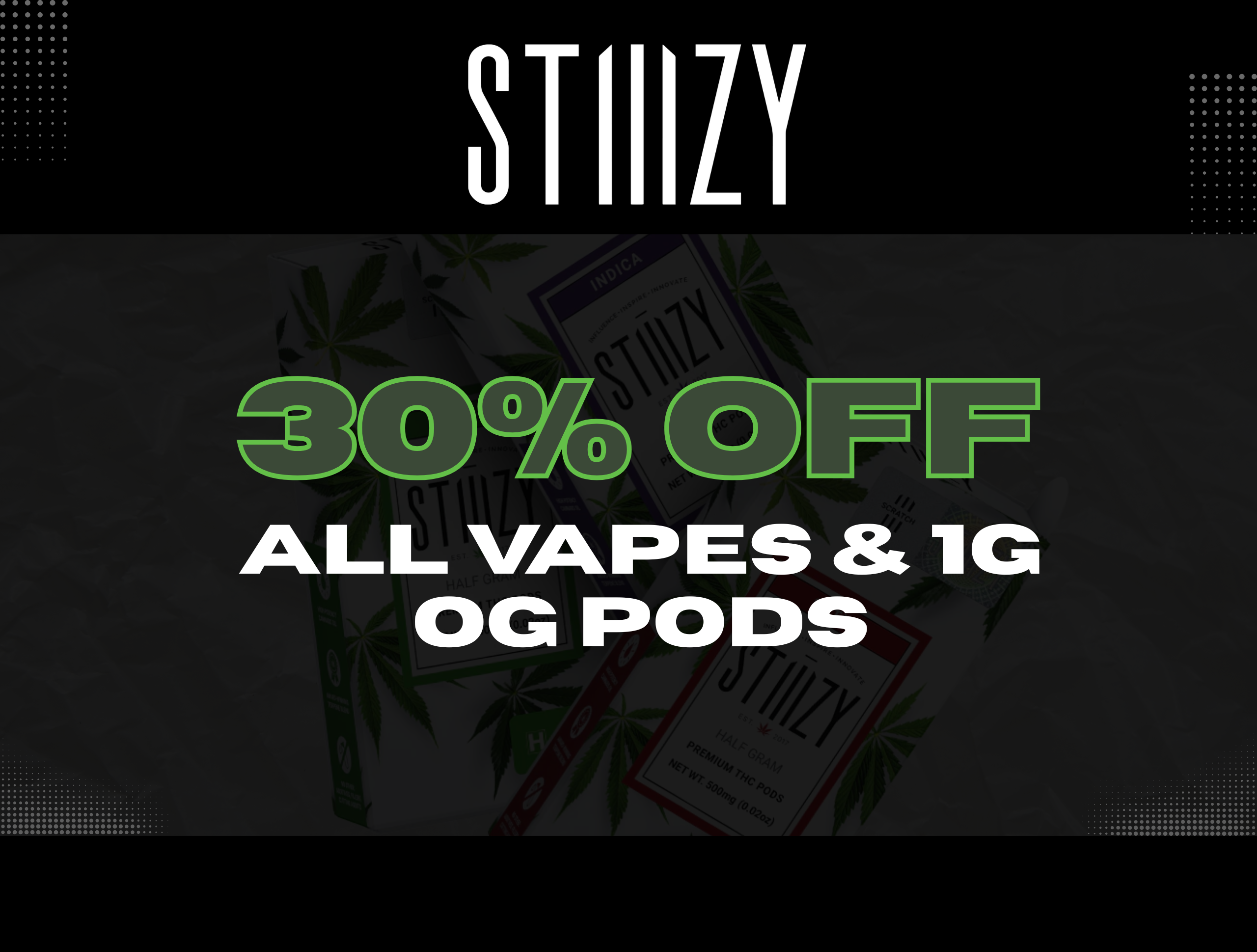 -SATURDAY: 20% OFF on all Prerolls -SUNDAY: 30% OFF on all Stiiizy Products 20% OFF on all Merch